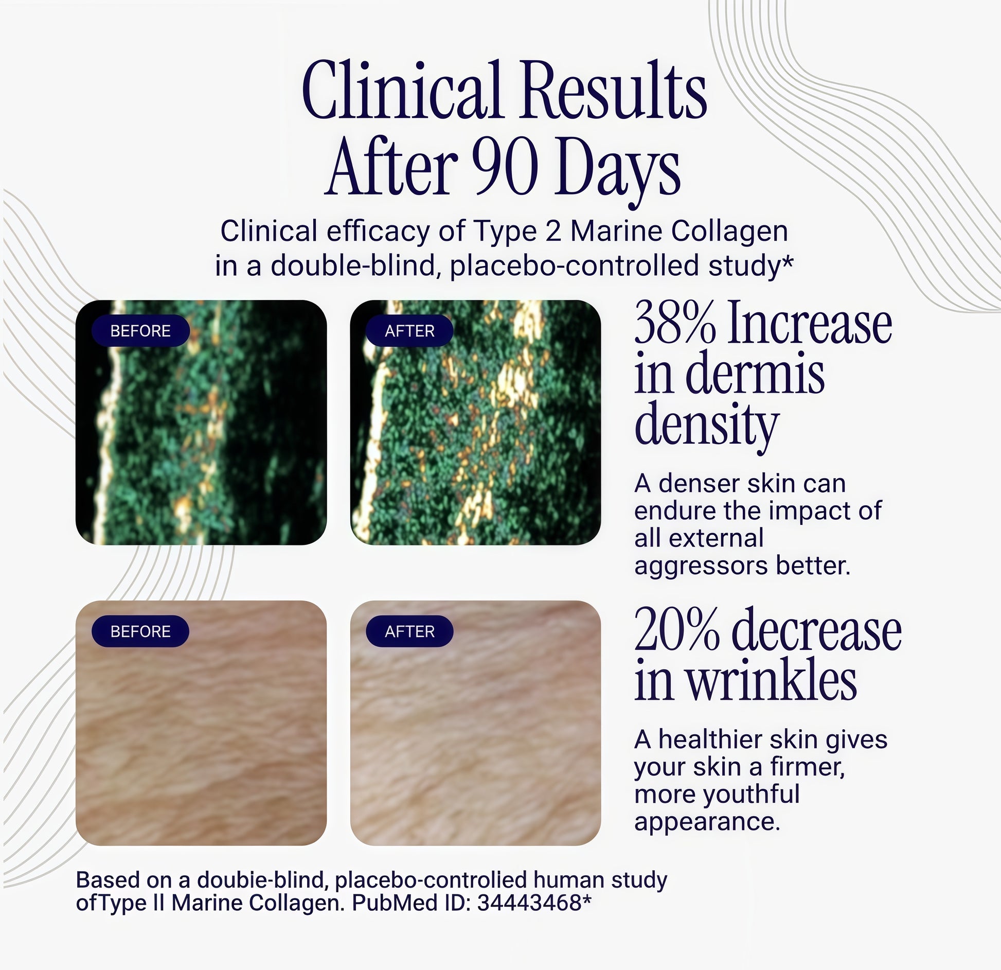 In a double-blind, placebo-controlled human study, participants taking this Type ll Marine Collagenexperienced a 20% reduction in wrinkle appearance over 90 days, particularly in frown lines and crow'sfeet areas.